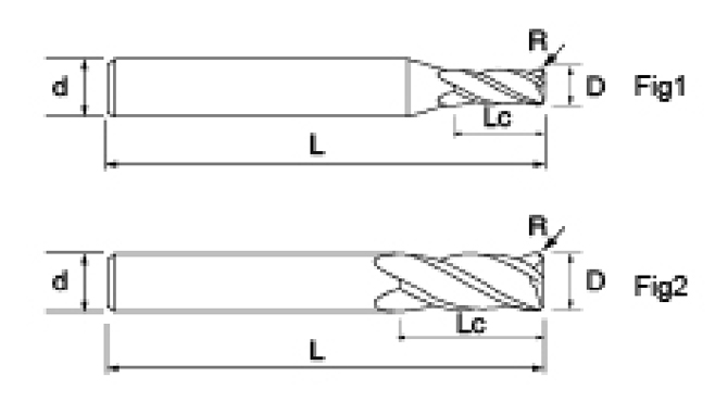 | Níl. | Trastomhas D | R Uillinn R | Fad an fhliúit Lc | Fad Foriomlán L | Shank Dia d | Comhaireamh Blade F |
