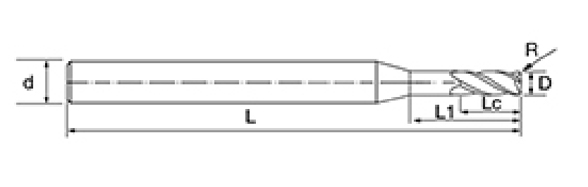 | Níl. | Trastomhas D | R Uillinn R | Fad an fhliúit Lc | Fad Éifeachtach L1 | Fad Foriomlán L | Shank Dia d | Comhaireamh Blade F |