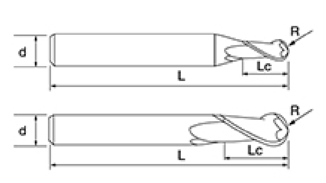 | Níl. | Trastomhas D | R Uillinn R | Fad an fhliúit Lc | Fad Foriomlán L | Shank Dia d | Comhaireamh Blade F |