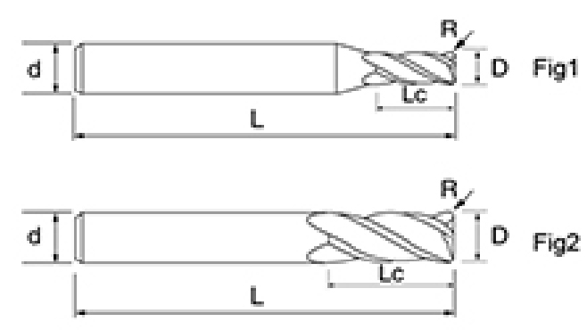 | Níl. | Trastomhas D | R Uillinn R | Fad an fhliúit Lc | Fad Foriomlán L | Shank Dia d | Comhaireamh Blade F |