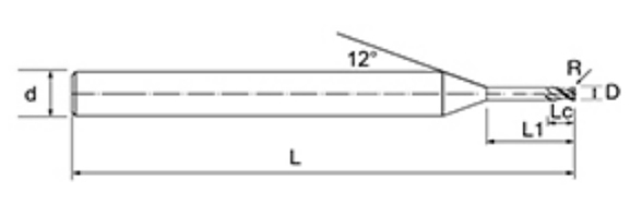 | Níl. | Trastomhas D | R Uillinn R | Fad an fhliúit Lc | Fad Éifeachtach L1 | Fad Foriomlán L | Shank Dia d | Comhaireamh Blade F |