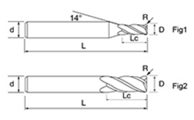 | Níl. | Trastomhas D | R Uillinn R | Fad an fhliúit Lc | Fad Foriomlán L | Shank Dia d | Comhaireamh Blade F |