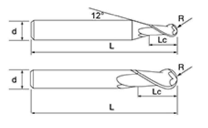 | Níl. | Trastomhas D | R Uillinn R | Fad an fhliúit Lc | Fad Foriomlán L | Shank Dia d | Comhaireamh Blade F |